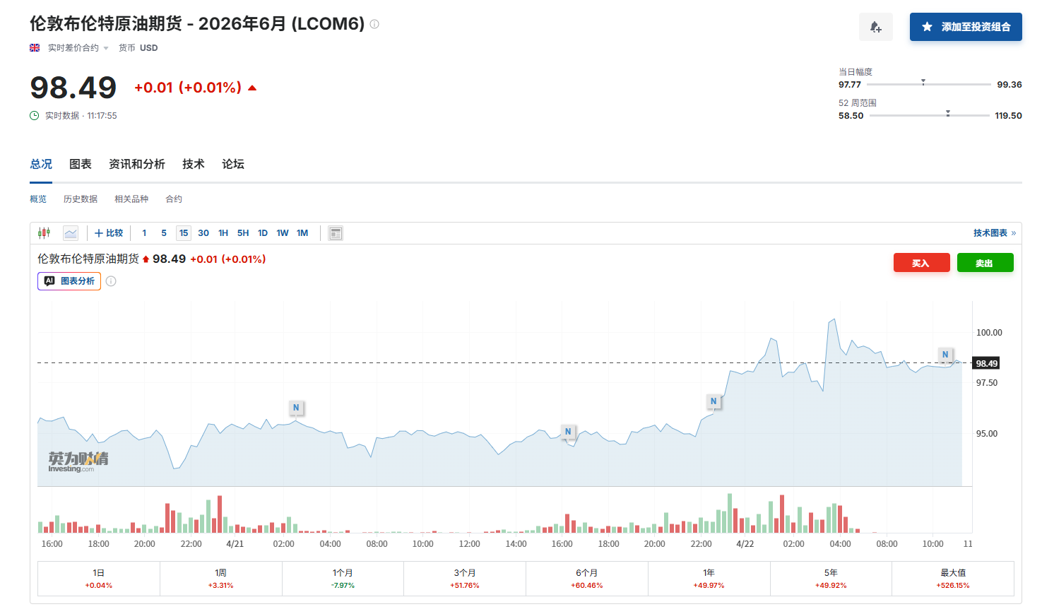 据央视新闻报道,美国总统特朗普当地时间周二宣布,应巴基斯坦陆军参谋长及总理的请求,将美国与伊朗之间为期两周的停火期限予以延长,并要求伊朗方面先提出统一的谈判方案。受此消息影响,国际油价大幅回落。截至发稿,布伦特原油期货徘徊在98美元/桶附近。